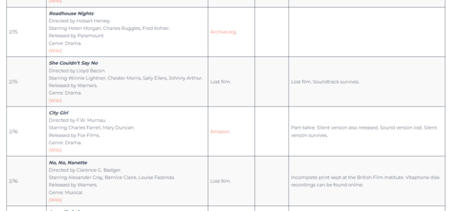 Other important and extremely time consuming thing I did! I announced it on my Bluesky, but I guess it’s probably helpful to share here. Check out my list of where to find the films of 1930, which covers all of the feature films that came out that year and where you can see them at, organized by release date.